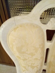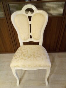 ダイニングチェアは、フレーム部分に光沢感があり、張地は上品なベージュ、葉やツタをモチーフにした