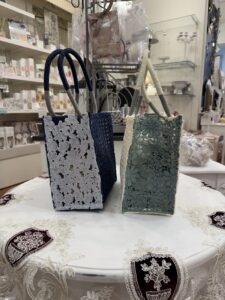 トートバッグブルーメン 軽やかな印象を与えるバスケットトートでサイドのフラワーレースが初夏の装いを演出してくれます( *´艸`)