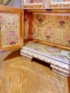 ご紹介する商品は、豪華な彫刻や複雑な曲線が目を引き、アンティーク仕上げとシェラック塗装で味わい深い質感に。