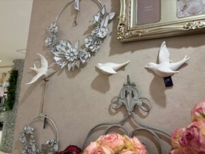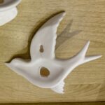 3羽なかよく群れをなして、壁面で羽ばたいているのは、素焼きのバードオーナメント。