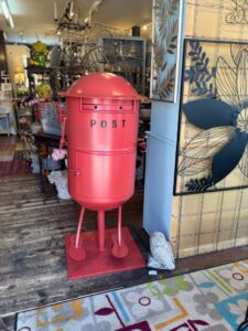 そんな日に入荷してきたのは、真っ赤な大きなロボット型のポスト型郵便受け(下のドアを開けると置配もできます)。