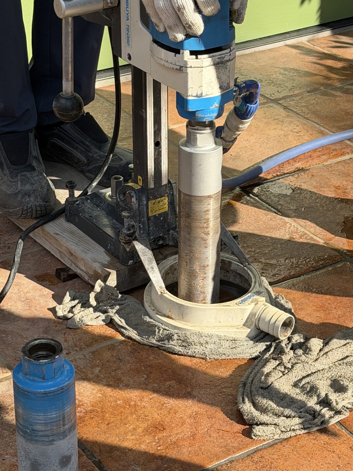 設置場所には非常に厚みのあるタイルと御影石があり、職人さんも「これだけの厚みがあると、穴を開ける刃がもつかな……」と心配されるほどの堅牢な造りでしたが、専用の機材(コア抜き)を使い、慎重に、そして確実に取り付けを行いました。