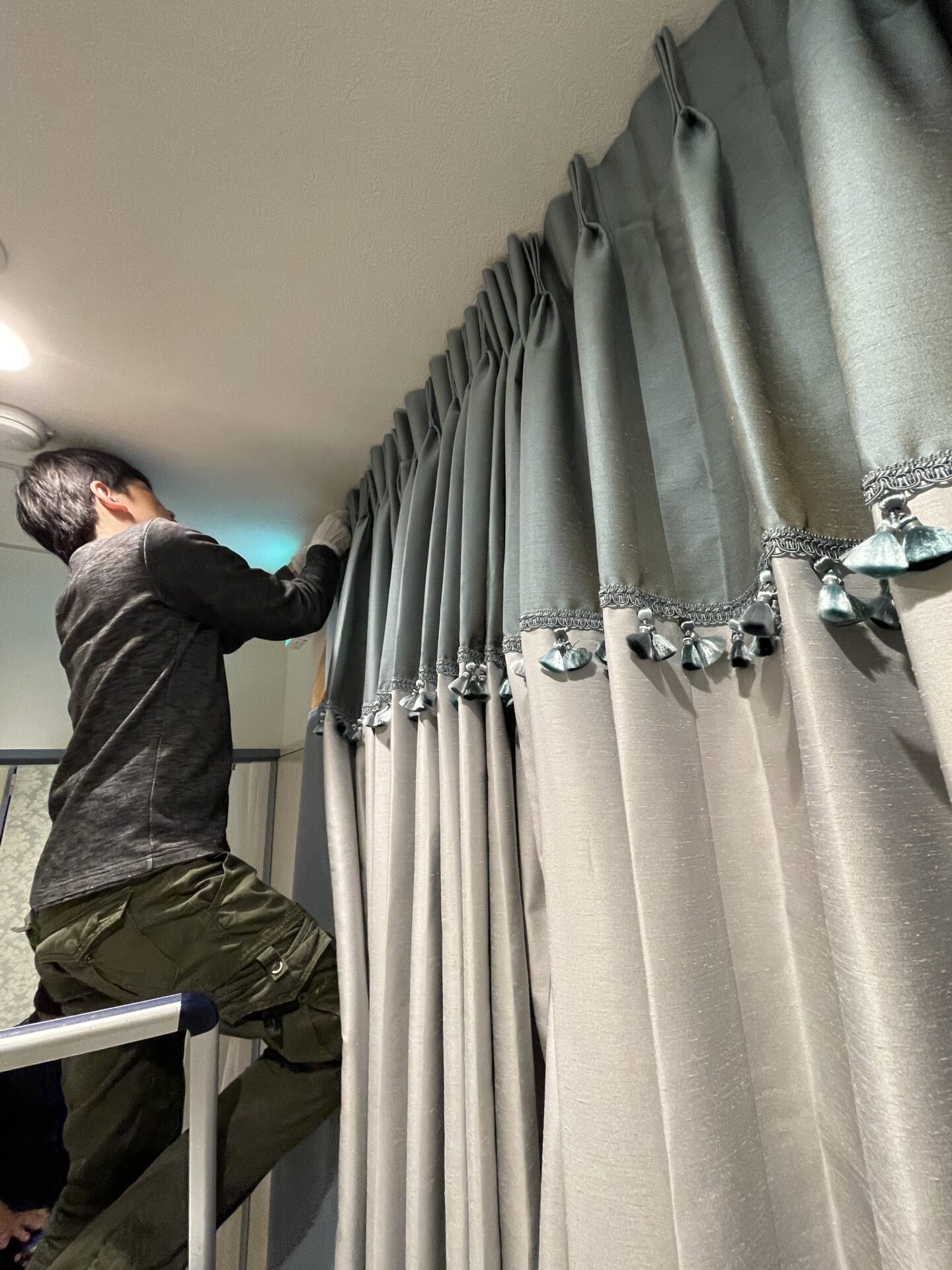 また、無機質な壁を隠すためのカーテンには、スッキリとしたバイカラー(2色使い)のデザインをセレクト。そこに装飾タッセルで甘さをプラスすることで、上品で落ち着きのある空間が完成いたしました。