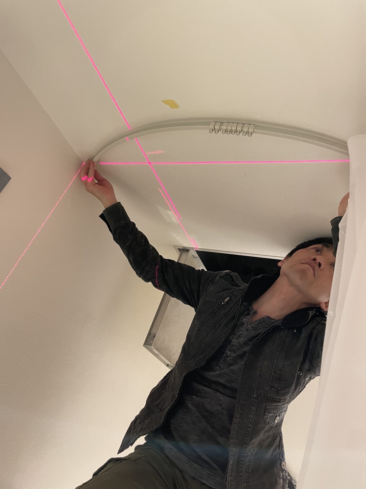 新設されたエステルームでは、洗面台と施術室を仕切るために、自由に形を調整できるカーテンレールを採用しております。あえて直線ではなく半円形に布を垂らすことで、空間に優雅さと優しさを演出いたしました。使用した生地は、透け感の美しい「アランフェス」。照明の点灯時と消灯時で表情がガラリと変わるため、その変化も楽しんでいただけるはずです。