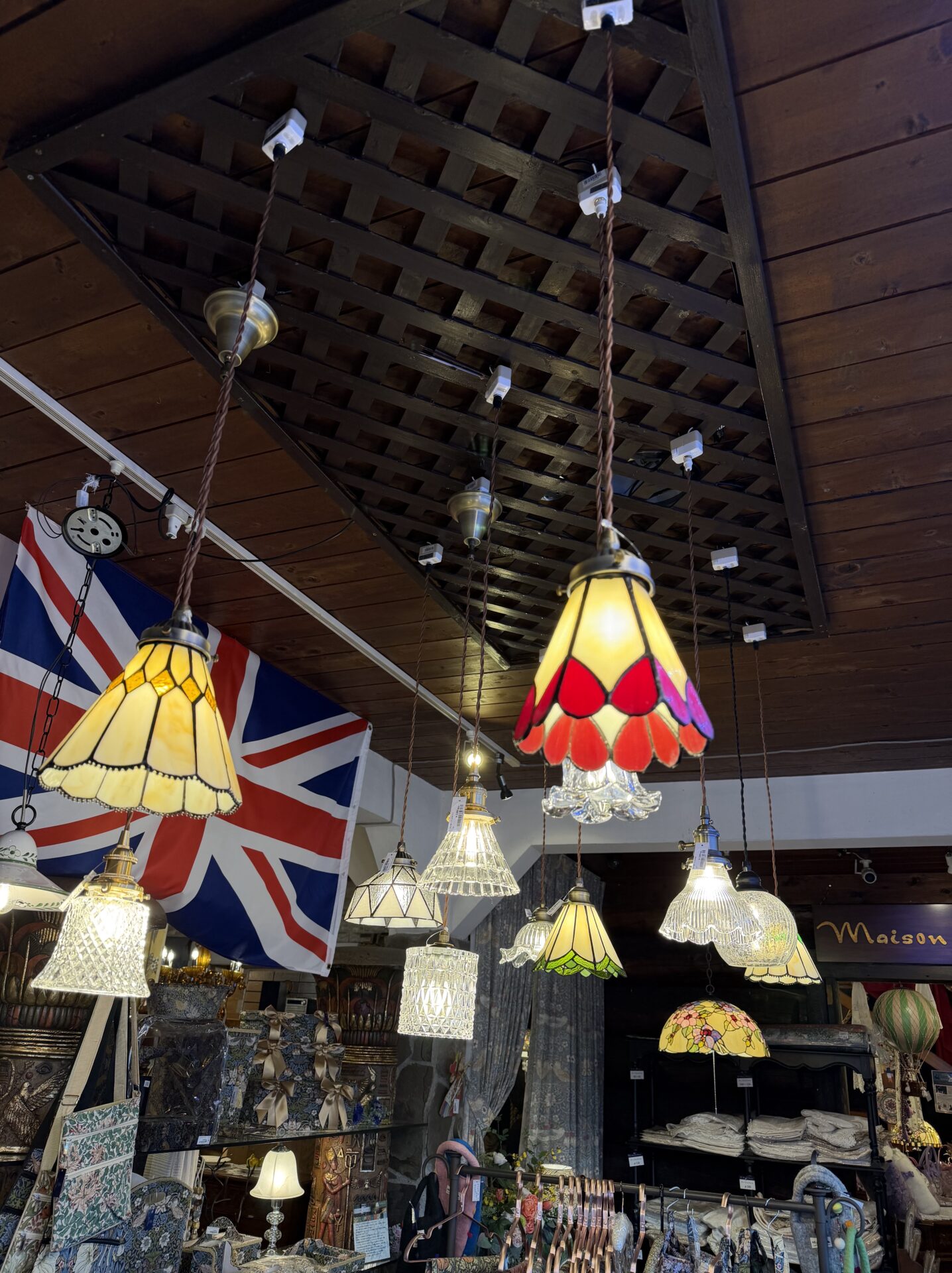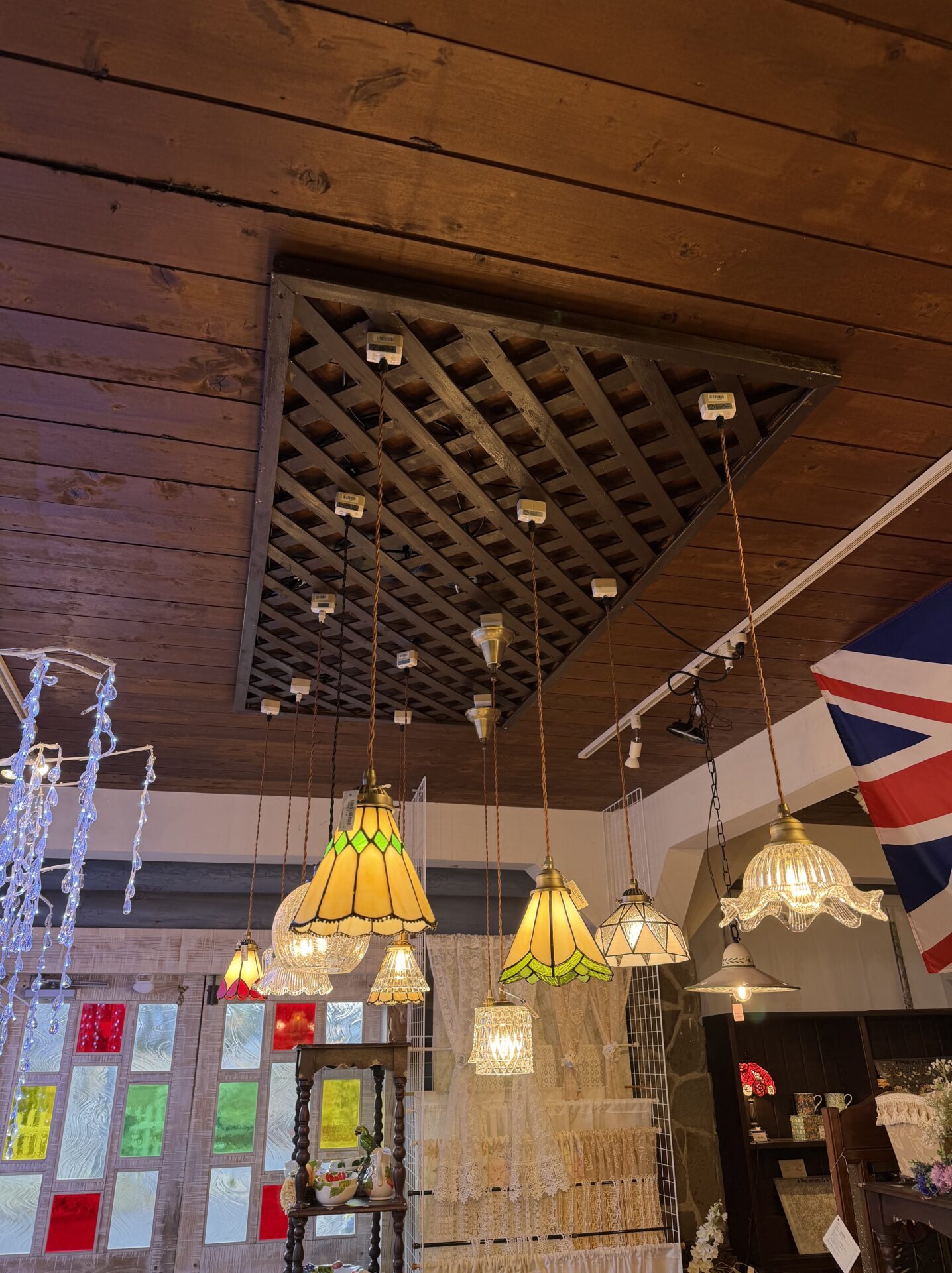 また、天井から吊り下げるペンダントライトも種類豊富に揃っております。 店内の天井を見上げれば、そこはまるで光のギャラリー。アンバー、ルビーレッド、スカイブルーなど、色彩豊かなガラスが並びます。