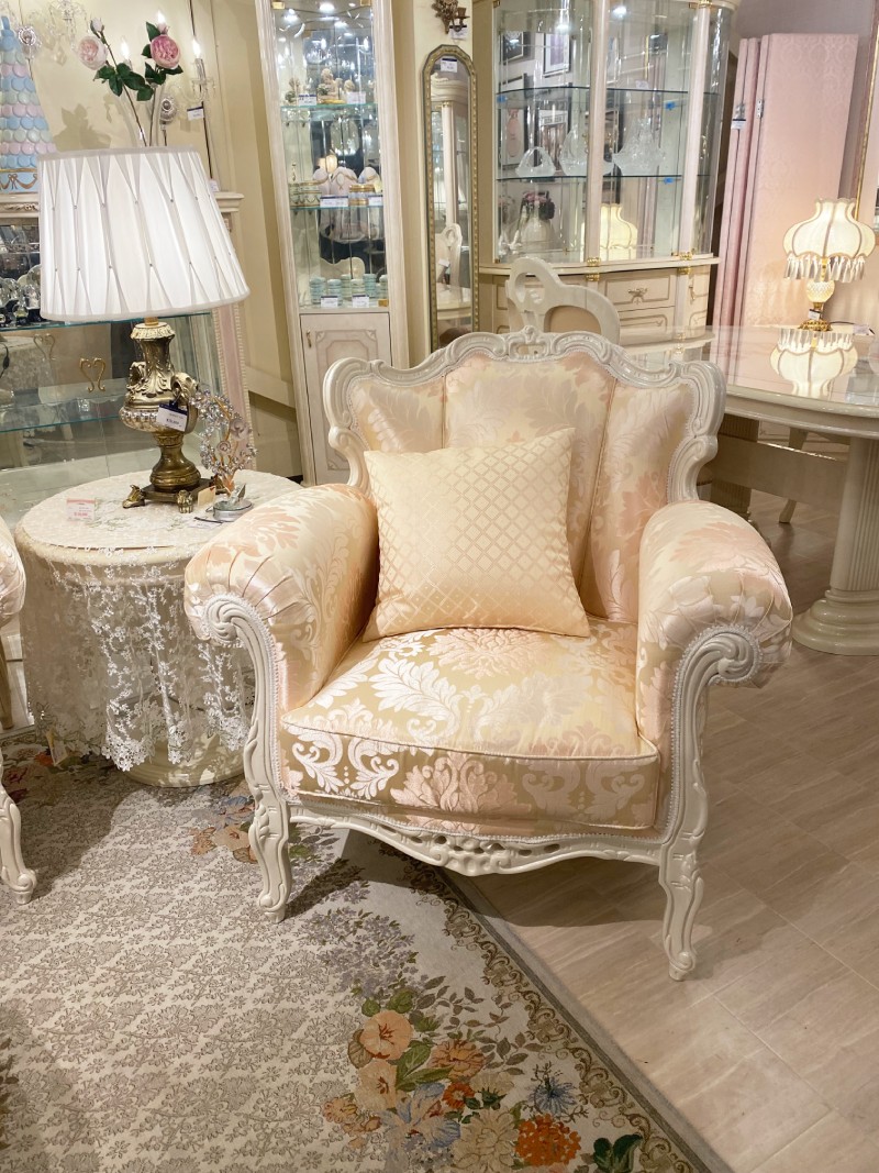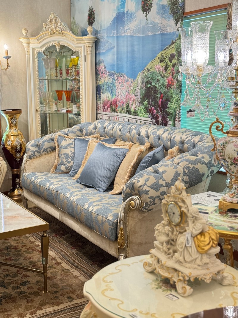 皆さまこんにちは、あべのハルカス近鉄本店です。 今回ご紹介するのは、イタリアのクラシック家具ブランド【Mobilsedia】モビルセディアの3人掛けソファ。 こちらは、幅190cmで、カラーはパールホワイト、そしてダマス・・・