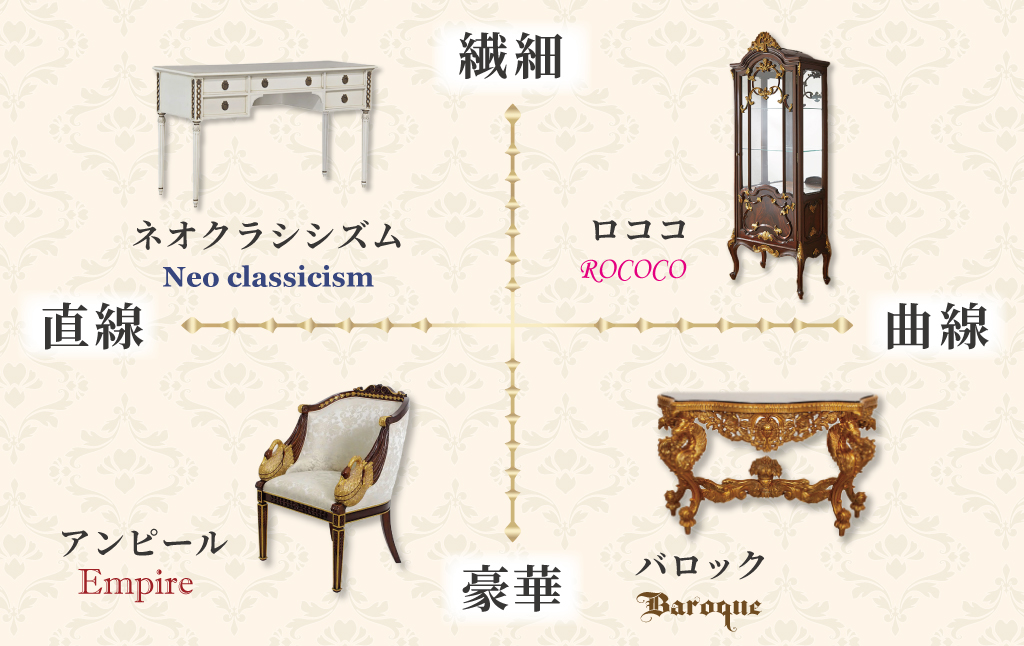 縦軸は“繊細”か“豪華”か、横軸は“直線”か“曲線”か。この4象限に、それぞれの様式を配置しています