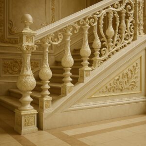 まず「バルボス」という名前ですが、これは建築用語の「バラスター(baluster)」から来ています。バラスターとは、階段の手すりやバルコニーの柵に使われる、細くて真ん中が膨らんだ柱のこと。これをそのまま家具の脚に応用したのが「バルボスレッグ」です。丸みのある膨らみが美しく、見た目にも触り心地にも上品な印象を与えます。