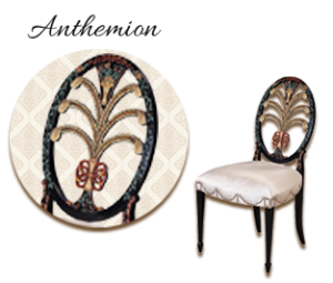 古代ギリシャの植物モチーフ「アンセミオン」を背もたれに取り入れた装飾的なデザイン。新古典主義やリージェンシー様式で流行し、知的で優雅な空間を演出しています。建築や彫刻にも使われるモチーフで、古典美への憧れと秩序ある美学を象徴しています。家具に芸術性と歴史的深みを与えるスタイルです。