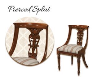 18世紀のチッペンデール様式に多く見られる、透かし彫りが施された背板。職人の高度な技術を要する装飾で、視覚的な軽やかさと格式を両立しています。植物や幾何学模様などのモチーフが多く、彫刻芸術としての価値も高い。貴族階級の邸宅や応接室で用いられた、芸術性の高いクラシックデザインです。