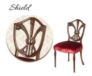 18世紀後半のフェデラル様式に登場した盾形の背もたれは安定感と格式を象徴します。ヘップルホワイト様式にも見られ、直線と曲線のバランスが美しく、控えめながらも品格のある印象を与えています。アメリカ独立期の精神を反映し、理性と秩序を重んじる新古典主義の流れを汲んだデザインです。