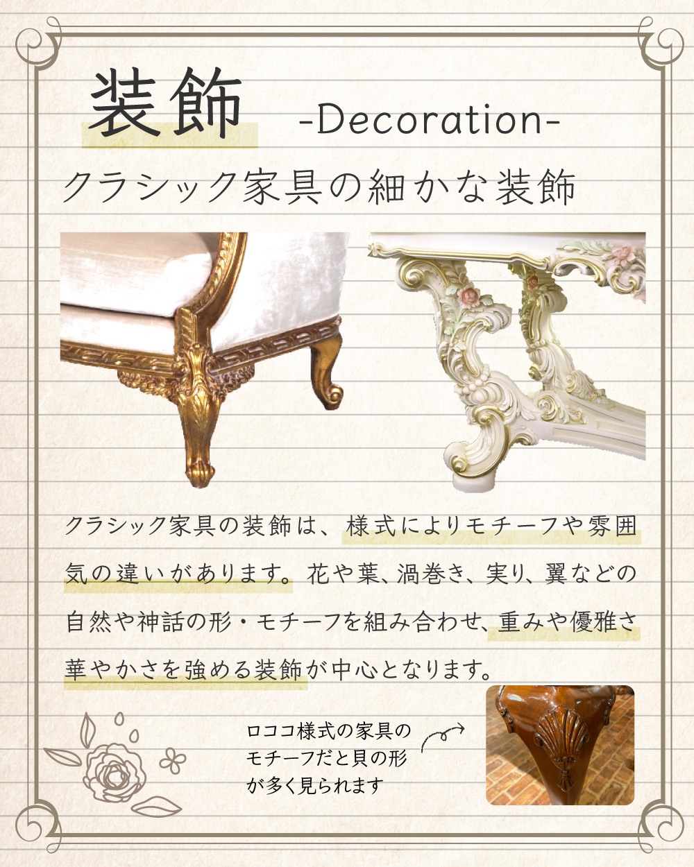 また、メゾン・ド・マルシェのHPでは、クラシック家具様式の解説ページから家具の知識まで、様々揃えております。